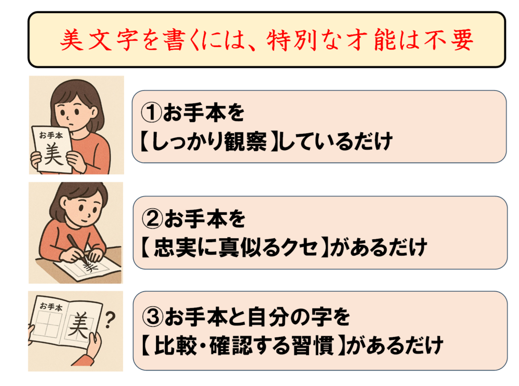 大切なのは、正しい形を見ながら「なぞる→見写す→再現する」の順で練習し、1日数分でも継続することです。