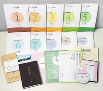 テキスト数 | ・メインテキスト全7巻(ひらがな・カタカナ・数字・楷書(2段階)・行書・実用書式など) ・映像教材(インターネット視聴) ・スタディガイド ・成績カード ・ソフト下敷き ・付録テキスト(筆ペンの書き方)・トレーニングブック2冊 ・添削課題提出用紙集 ・課題提出用封筒 ・硬筆書写ハンドブック |