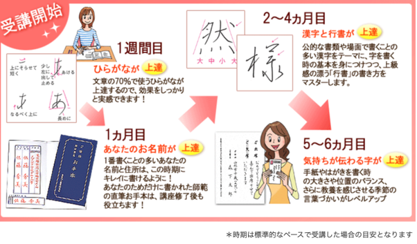 対応資格 | ・文部科学省後援の硬筆書写検定(2級合格レベルまで上達可能) ・日ペン独自の硬筆書道教師、教室書道師範の資格 |