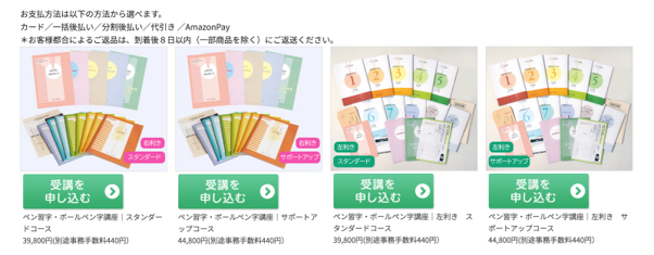 費用 | ・スタンダードコース12か月:39,800円(税別) ・サポートアップコース24か月:44,800円(税別) ※別途事務手数料440円が必要、送料無料 ※分割払いにも対応 ※後払い、クレジットカード払い、代金引換、Amazonpayでの支払いが可能 |