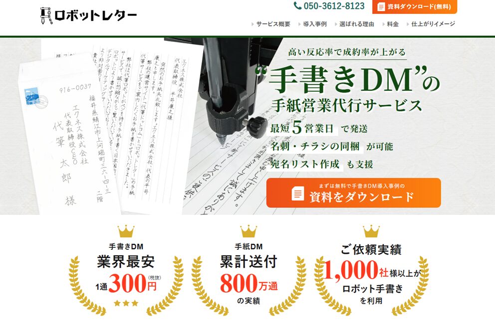 サービス内容 | ・ロボットによる手書き風代筆代筆 ・封入・発送までを一気通貫で行う ・経験豊富なプロチームによる文面作成支援 ・短納期対応(最短5営業日で発送) |