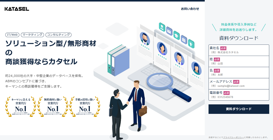 カタセル | 株式会社カタセル | 要問い合わせ | ・リスト作成(約2.4万社DB活用) ・文面代行 ・発送代行 ・商談喚起支援 | https://katasel.com/ | ・大手・中堅向け。独自データベースで精度の高いターゲティング。 ・無形商材・高単価商材のキーマン向け。 |