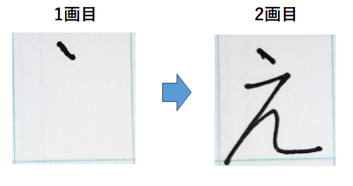 | 2画目:後半 (払い+曲線+横線) | 右上から左下への斜線→下への曲線→90度を意識した縦線からの横線 | 1.横線部分はやや右上がりに。 2.下に曲げながら「え」の丸みをつくる。 3.最後は真横に線を引く。 |